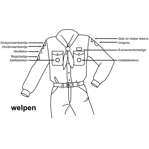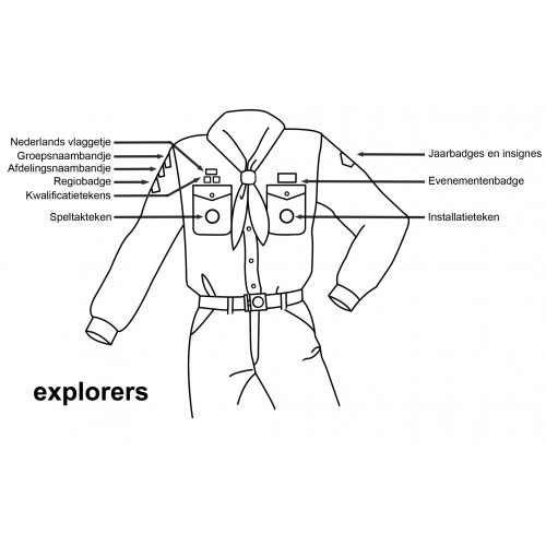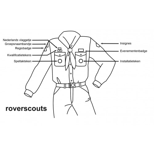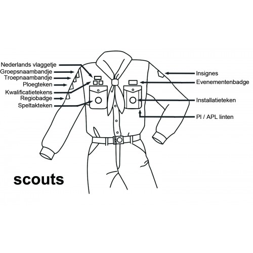 Je installatieteken, speltakteken en andere insignes krijg je van de groep. Je krijgt deze bij je installatie, door mee te doen aan grote activiteiten of wanneer je ze verdiend hebt door je vaardigheden te laten zien. Deze insignes mag je dragen op je scoutfit blouse. Hieronder zie je wat waar thuishoort op je blouse, navigeer zelf via onderstaande slider naar de juiste speltak: