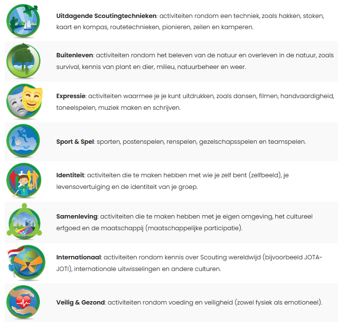 Binnen scouting werken wij met de volgende activiteitengebieden om ons programma vorm te geven: